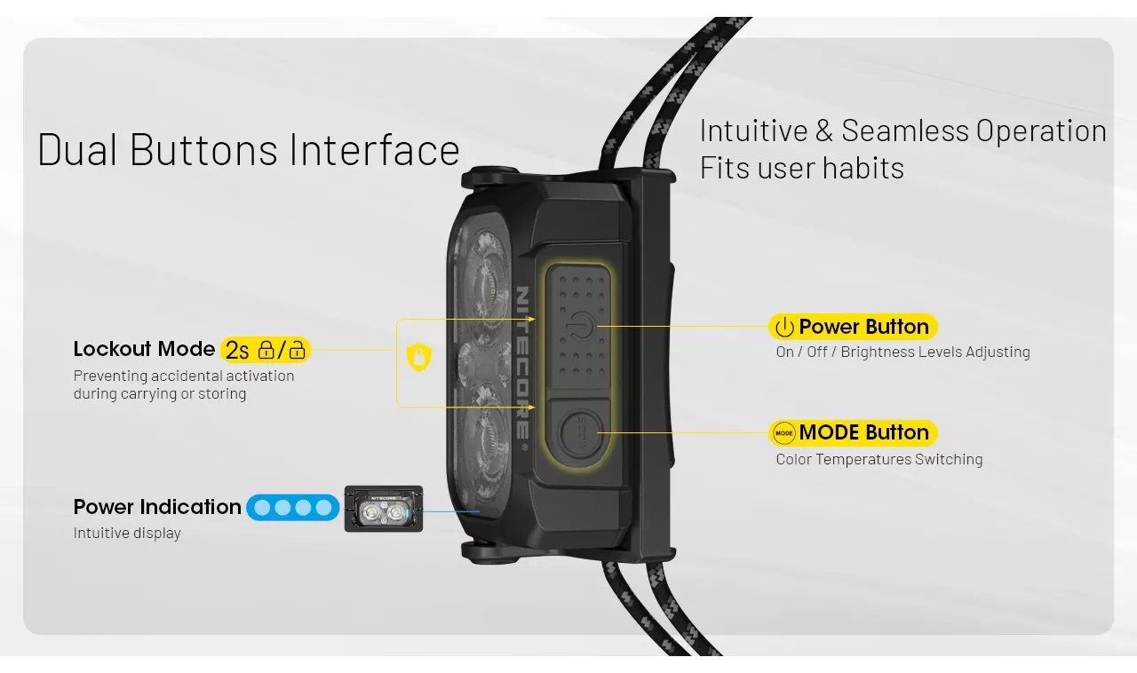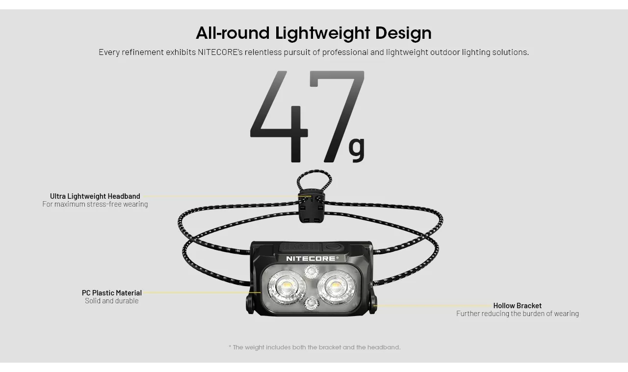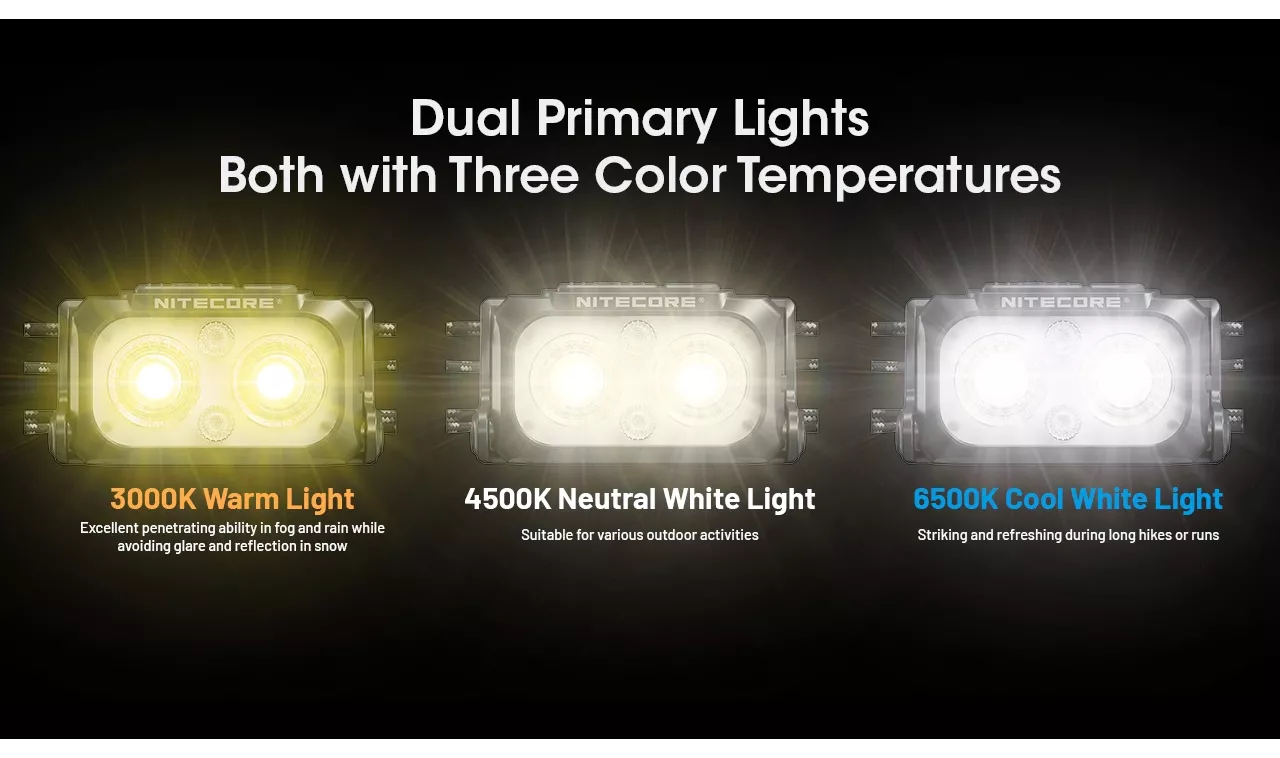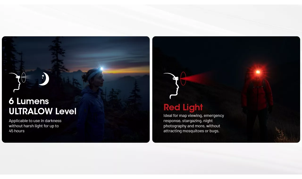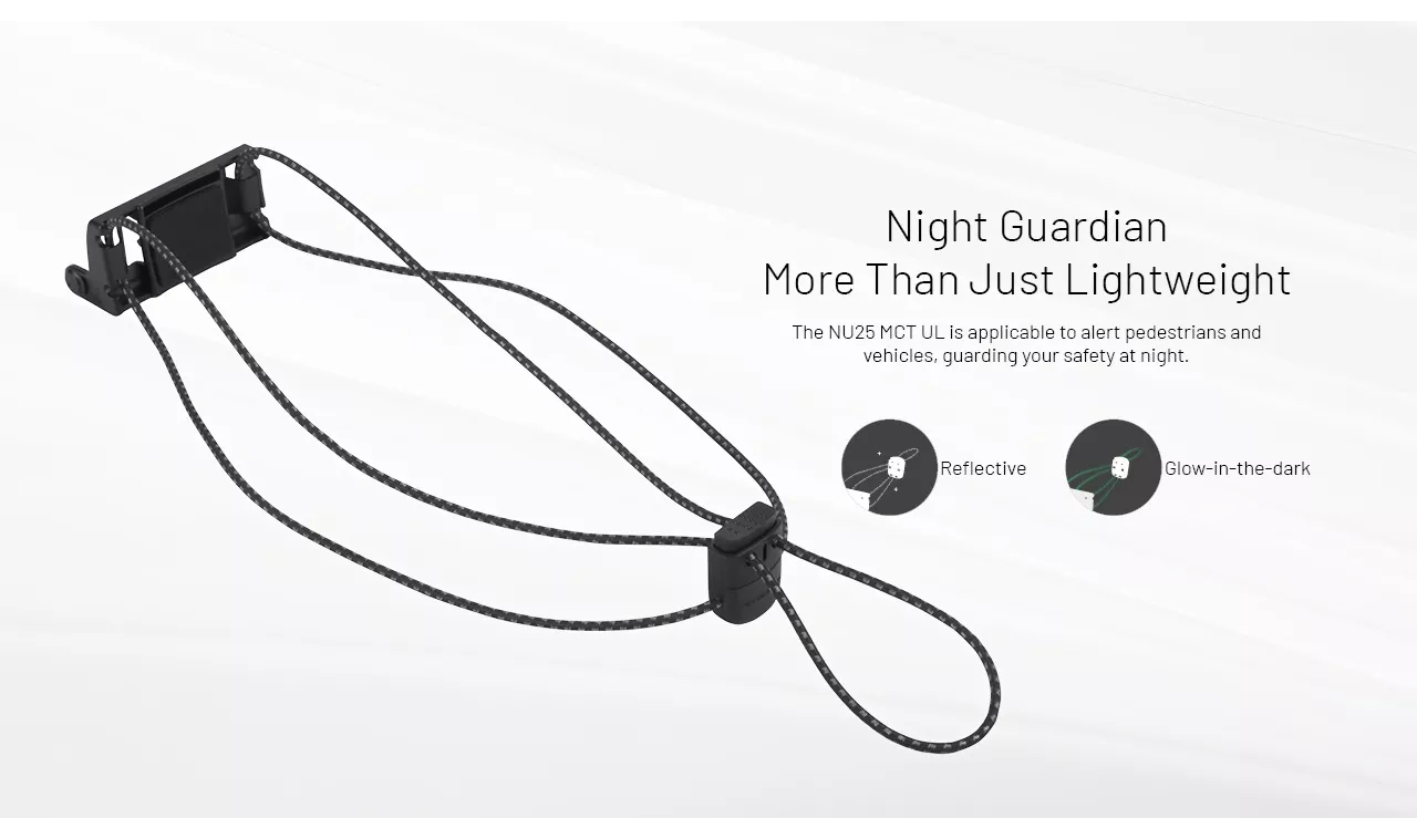 NITECORE NU25 UL – ultralengvas įkraunamas galvos žibintas, naudojantis MCT UHE LED technologiją, leidžiančią pasirinkti tris spalvines temperatūras (šiltą / neutralią / šaltą). Įrenginys sujungia spot (taškinį) ir flood (plataus apšvietimo) modulius, taip pat turi raudonos šviesos LED. Maksimalus šviesos srautas – 400 liumenų, o maksimalus nuotolis – 132 metrai. Integruota 700 mAh Li-ion baterija užtikrina ilgą veikimo laiką, o USB-C įkrovimas leidžia greitai papildyti energiją. Korpusas kompaktiškas (60,0 × 33,0 × 25,7 mm) ir sveria ~ 47 g. Žibintas turi specialius režimus (BEACON, SOS, lėtas mirksėjimas), IP66 atsparumo laipsnį ir spindulio intensyvumą ~ 4 351 cd.