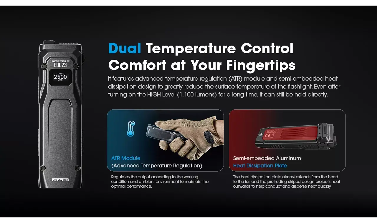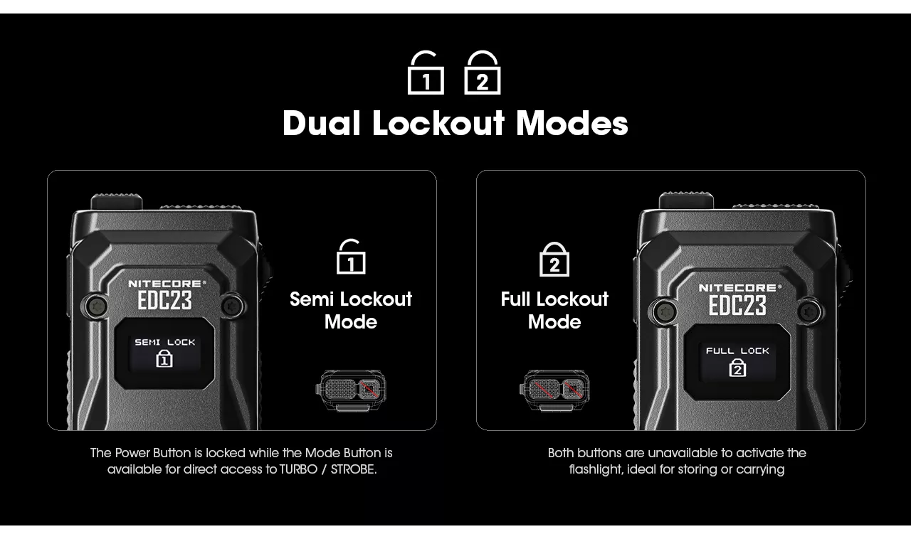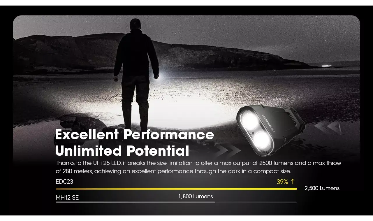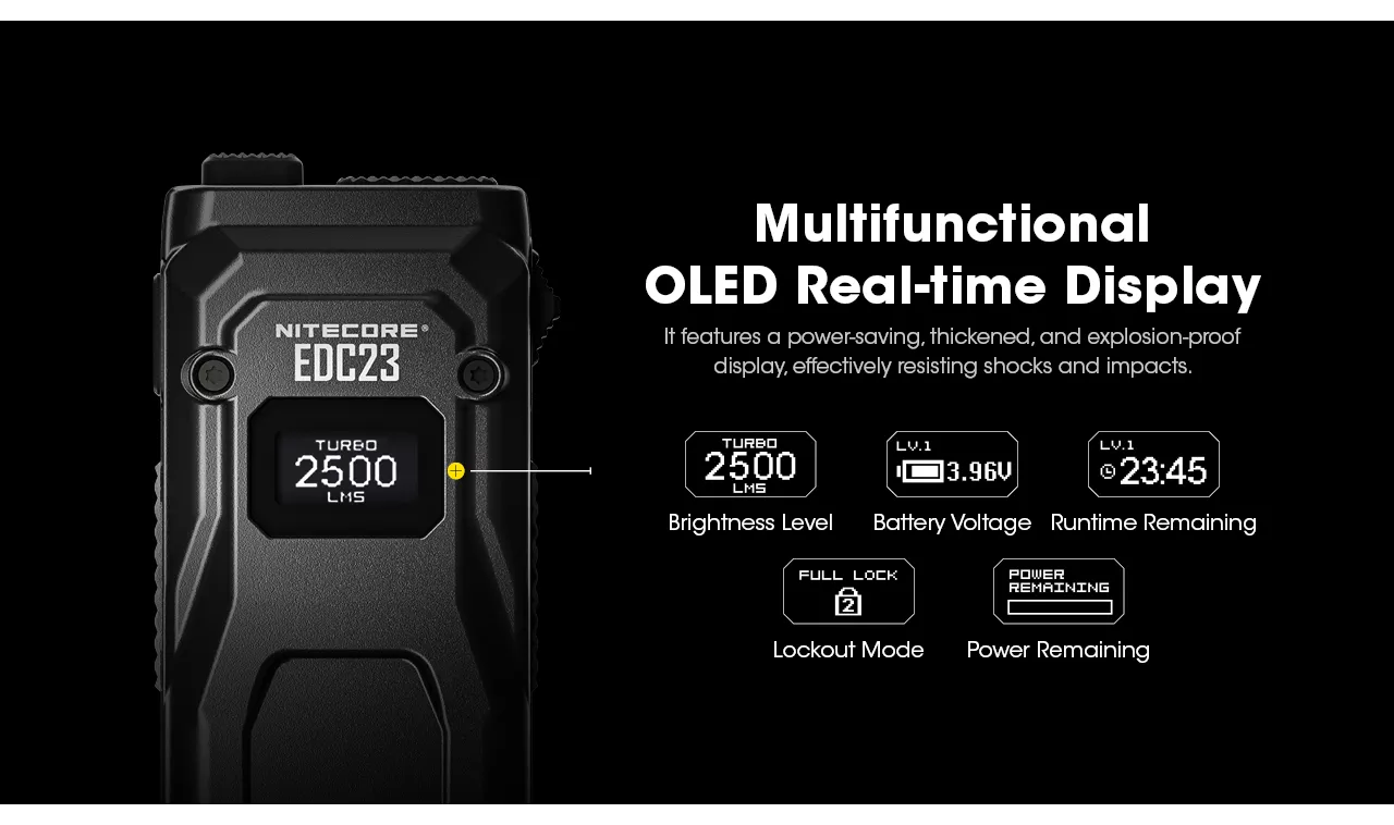 Įrenginys turi OLED ekraną, rodantį realiu laiku informaciją (ryškumo lygį, likusį baterijos laiką, įtampą). EDC23 palaiko Rapid Lock™ mechanizmą su pusiau ir pilnu užrakinimu, dviejų lygmenų taktinė / momentinė Turbo & Strobe funkcija, temperatūros valdymą (ATR) automatiškai mažinant galingumą esant perkaitimui. Įmontuota 1 500 mAh Li-ion baterija, įkrovimas vyksta per USB-C, įkrovimo laikas ~ 1,5 valandos. Apsauga nuo išorės veiksnių – IP54 (apsauga nuo dulkių ir purslų).