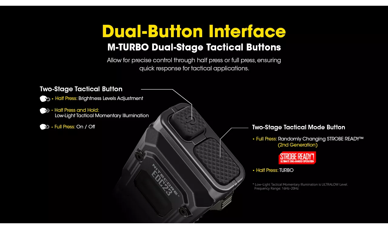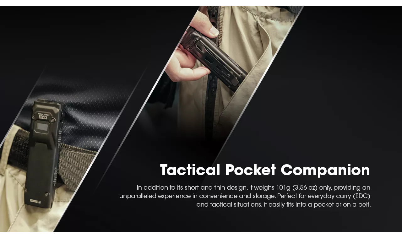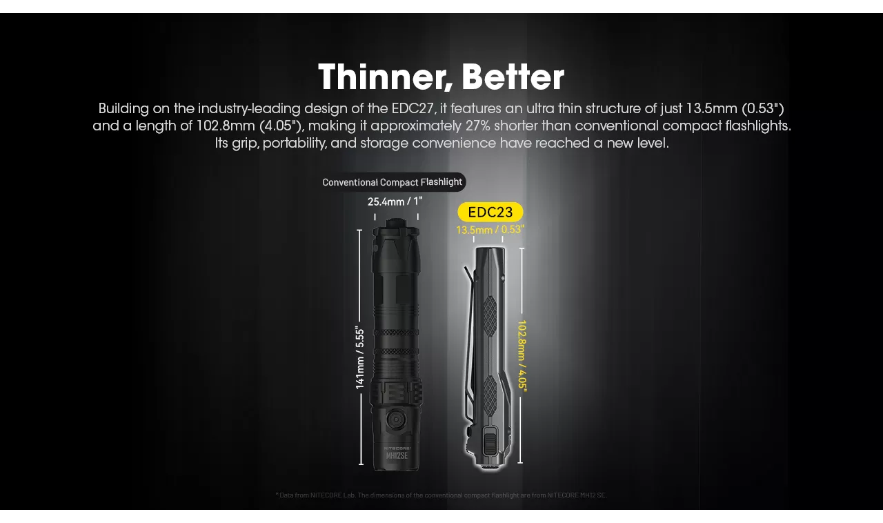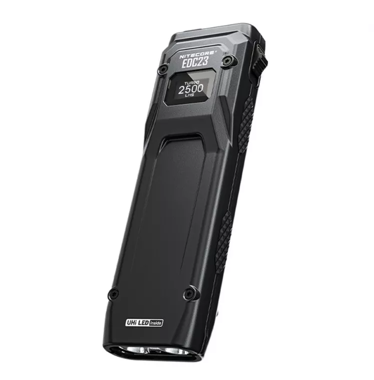 NITECORE EDC23 Saber – plonas, kompaktiškas EDC tipo žibintas, sukurtas optimizuoti laikymą kišenėje ir patogumą nešioti. Jame naudojami du UHi 25 LED moduliai, kurie leidžia pasiekti iki 2 500 liumenų šviesos srauto ir spindulio nuotolį iki ~ 280–306 jardų (≈256–280 m). Korpusas turi vos 13,5 mm storį ir bendrą ilgį 102,8 mm. Jis pagamintas iš plieno (priekinis ir galinis dangteliai) bei anglies pluošto / aliuminio konstrukcijos komponentų, užtikrinančių tvirtumą ir lengvumą.
