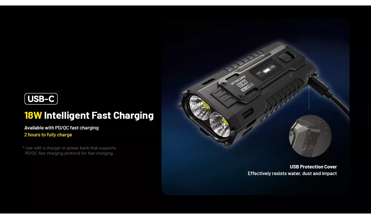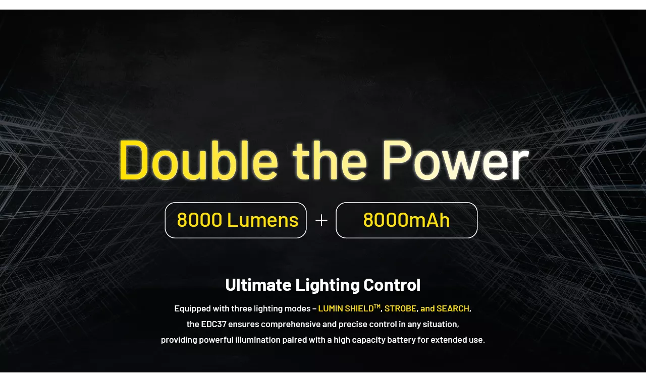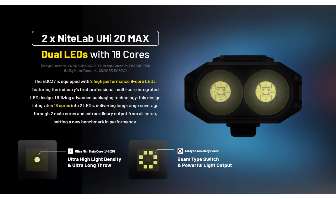 NITECORE EDC37 – galingas, prikrautas funkcijų EDC stiliaus prožektorius / žibintas su plokščiu korpusu. Įrenginyje įdiegti du UHi 20 MAX LED moduliai, leidžiantys pasiekti iki 8 000 liumenų ryškumą ir šviesos spindulį iki 420 metrų. Įmontuota 8 000 mAh ličio jonų baterija užtikrina ilgą veikimo trukmę. Yra LUMIN SHIELD™, Search ir STROBE režimai. Įrenginys turi du dviejų pakopų valdymo mygtukus (vienas – išorinėms funkcijoms pritaikomas), Rapid Lock™ slankiojančią užrakinimo jungtį, OLED ekranėlį su informacija apie ryškumą ir baterijos likutį. Konstrukcija pasižymi teksūra, užtikrinančia gerą sukibimą. Taip pat numatyta efektyvi šilumos sklaida ir integruotos kietųjų keramikinių aštrių galai, tinkami langų griaunimui arba gelbėjimo situacijoms.