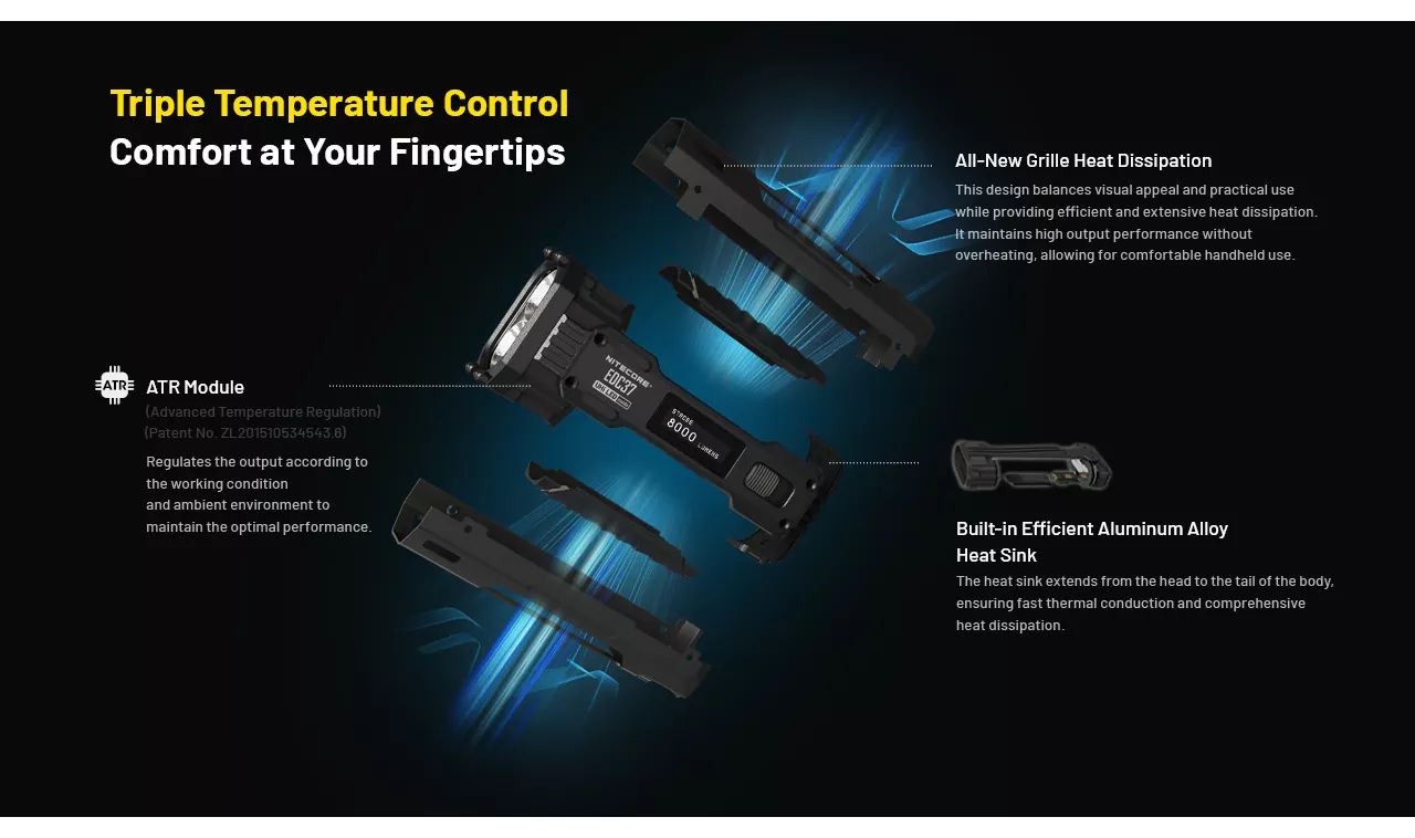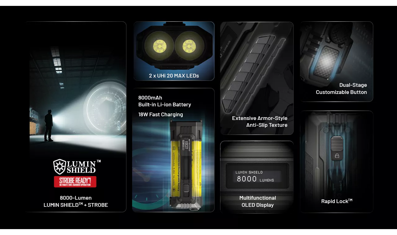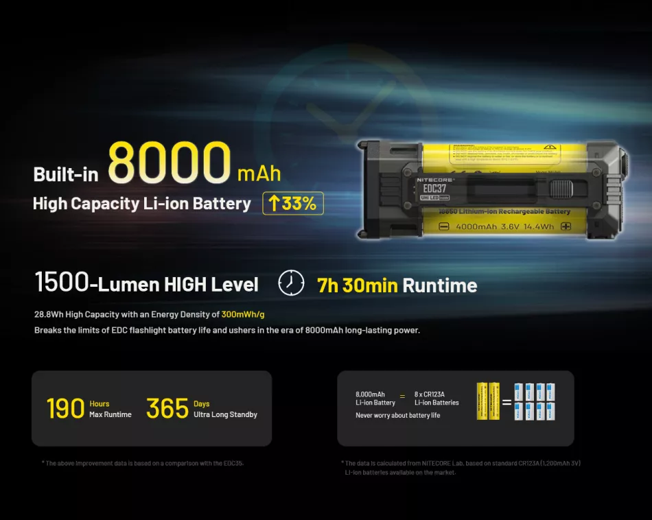 NITECORE EDC37 – plokščias, galingas prožektorius / EDC žibintas su 8 000 liumenų, LUMIN SHIELD™, dviejų LED modulių sistema, OLED ekranu ir integruota 8 000 mAh baterija.