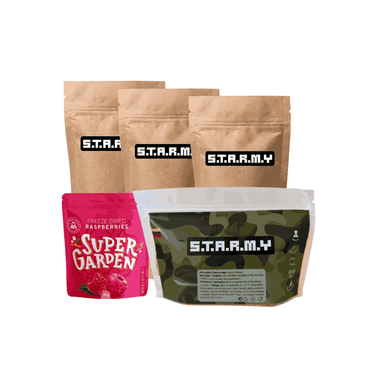 STARMY B8 – tai visavertis ir subalansuotas maisto davinys, skirtas 8 valandoms. Lengvas, kompaktiškas ir ilgo galiojimo – idealus pasirinkimas kelionėms, darbui, tarnybai ar ekstremalioms situacijoms. Visi patiekalai yra pilnai liofilizuoti (šaltyje džiovinti), todėl išsaugo natūralų skonį, aromatą ir maistines savybes. Paruošimas ypač paprastas – užtenka užpilti karštu vandeniu ir vos po kelių minučių galima mėgautis sotu, skaniu bei visaverčiu patiekalu.