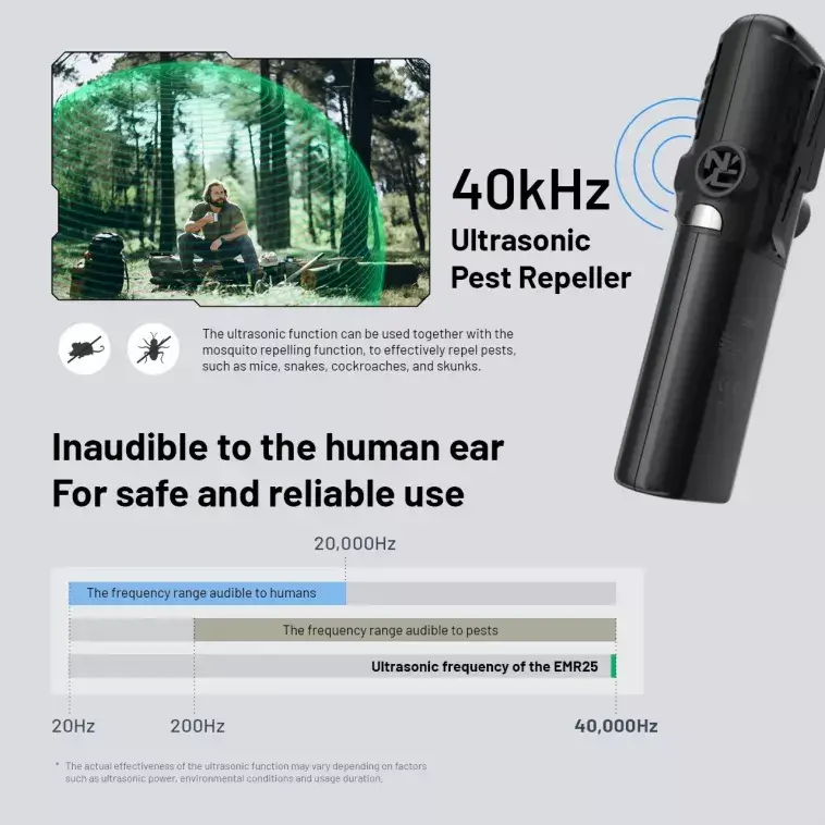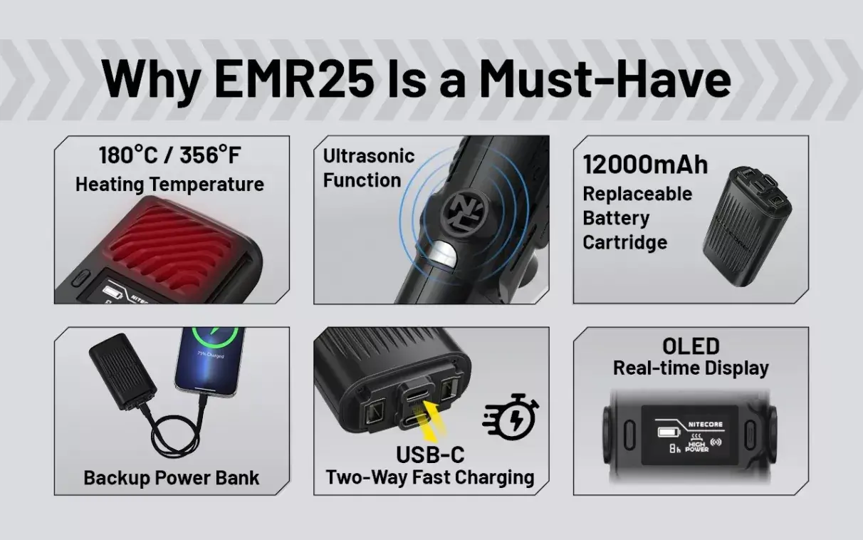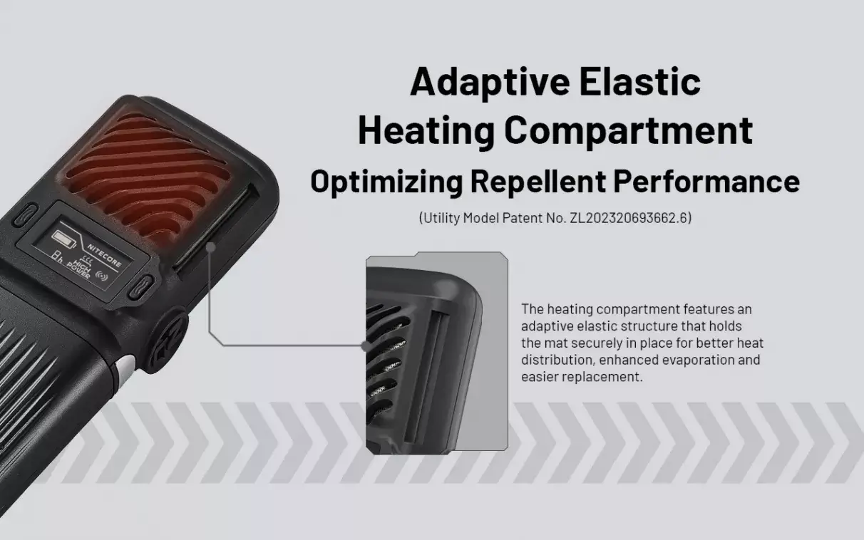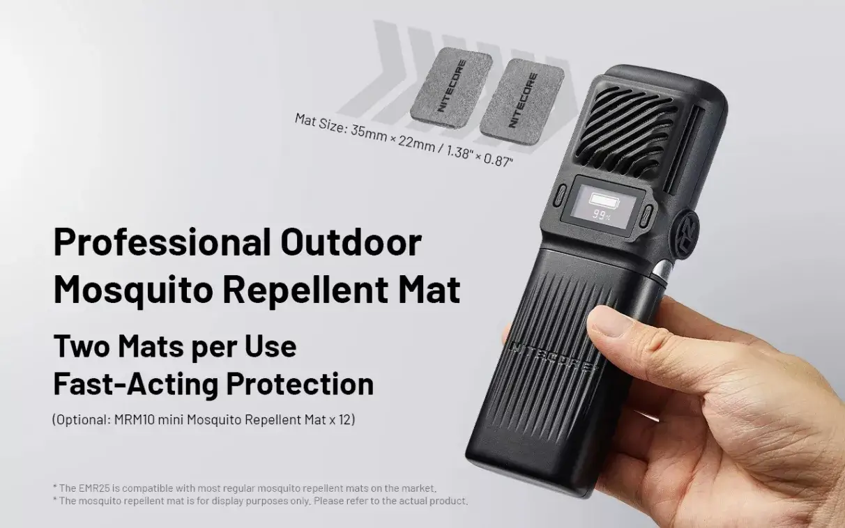 NITECORE EMR25 yra profesionalus 3-in-1 elektroninis vabzdžių atbaidymo įrenginys, sujungiantis šiluminį repelentą (iki 180 °C), ultragarsinę technologiją (40 kHz) ir 12 000 mAh talpos išorinę bateriją. Sukuria apsaugos zoną (~5 m spinduliu) per 10 minučių ir veikia iki 12 valandų vienu įkrovimu. Įrenginys aprūpintas keičiama baterija, IPX5 atsparumu vandeniui bei greito įkrovimo funkcija (USB-C). Tinka naudoti kelionėse, stovyklose ar lauko darbams.